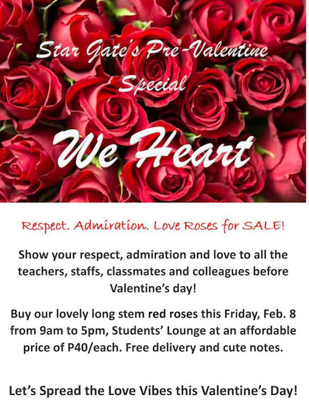 『朝9時から夕方5時まで先着60本のバラをラウンジにて販売致します。誰かにバラを送りたい方は、ラウンジまでお買い求めください。本数が限られていますので、早い時間帯のお買い求めをおすすめ致します。もしも、直接渡すのが恥ずかしい方の為に匿名でのデリバリーサービスがあります(笑)